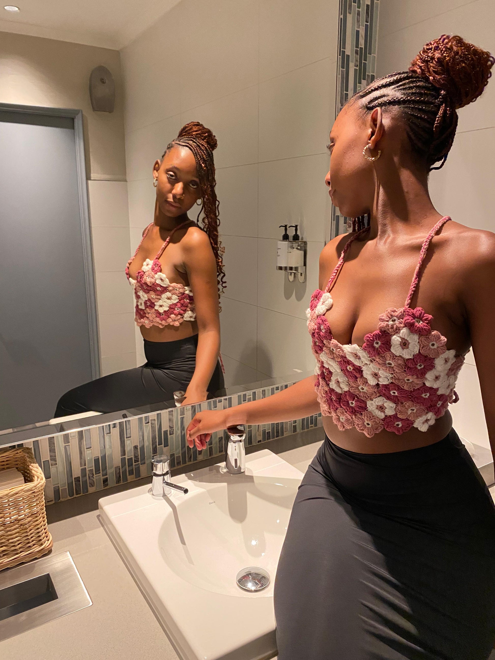 Turn heads with this handmade floral crochet crop top, featuring delicately stitched 3D flowers in soft shades of pink, blush, and white. Each flower is carefully crafted and arranged to create a stunning, feminine silhouette that hugs the body comfortably.